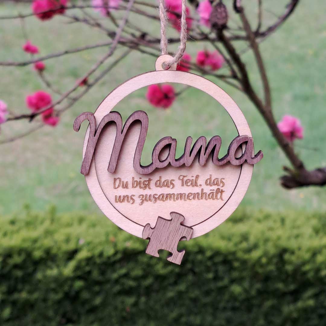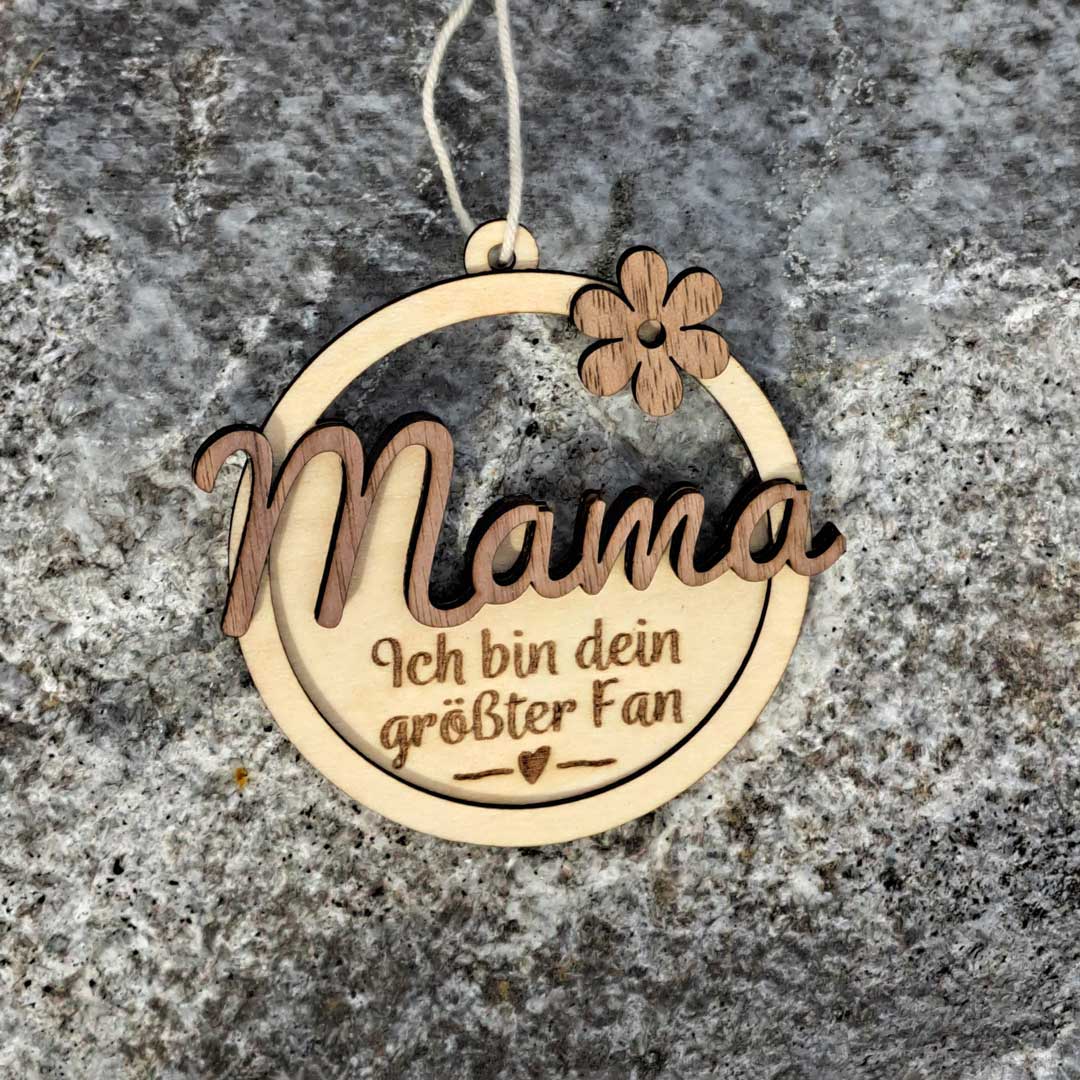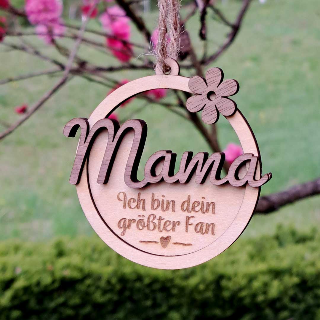 Lasergeschnittener Deko- und Geschenkartikel mit 3D-Tiefeneffekt. Der Schriftzug „Mama“ und das Dekoelement sind aus 3mm Nussholzfurnier lasergeschnitten und auf 2 verschiedene Lindensperrholz-Schichten verleimt. In der 3 Schicht befindet sich die Lasergravur.