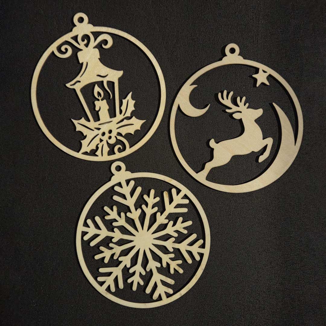 9 Stück lasergeschnittene, gravierte Christbaumkugeln mit verschiedenen Weihnachtsmotiven.