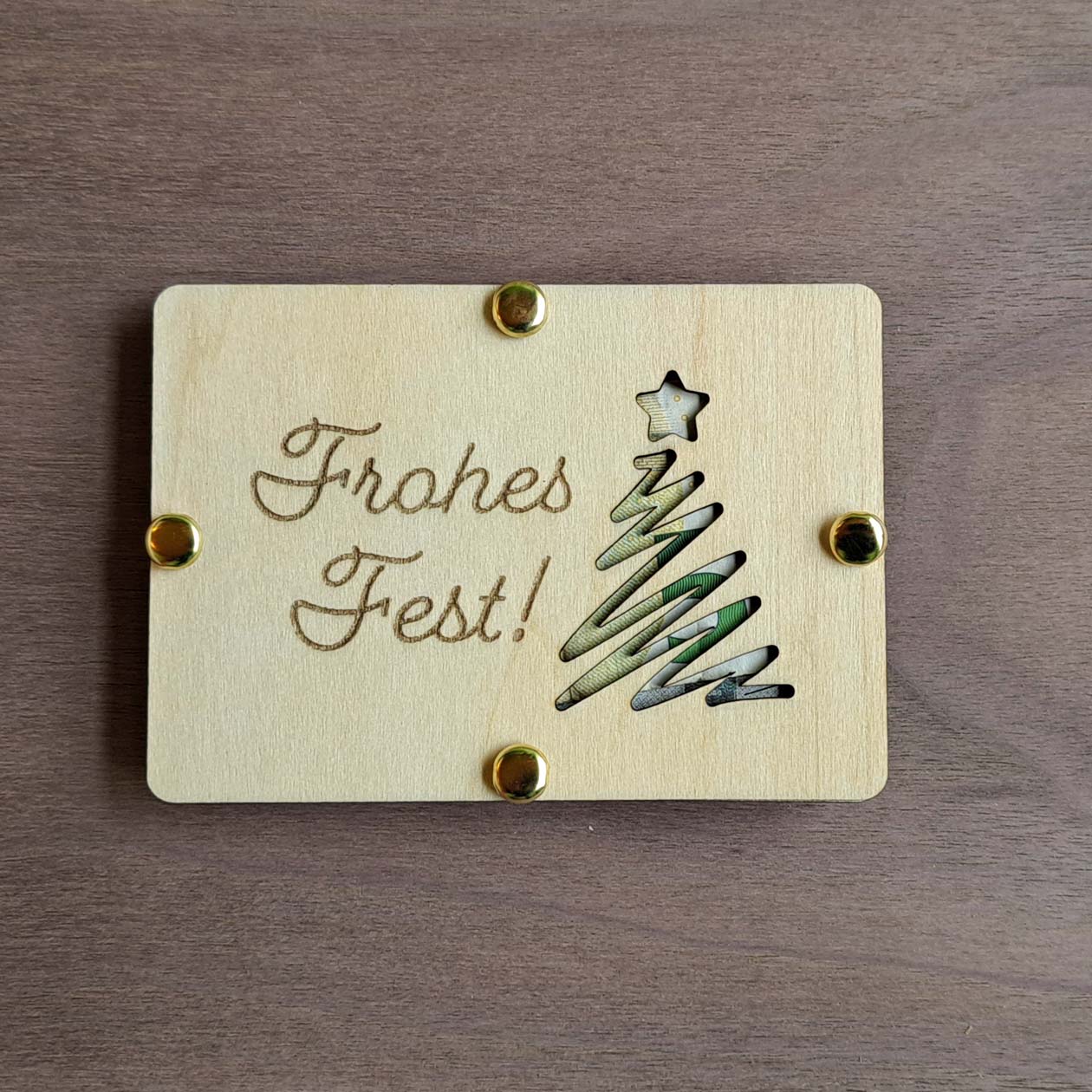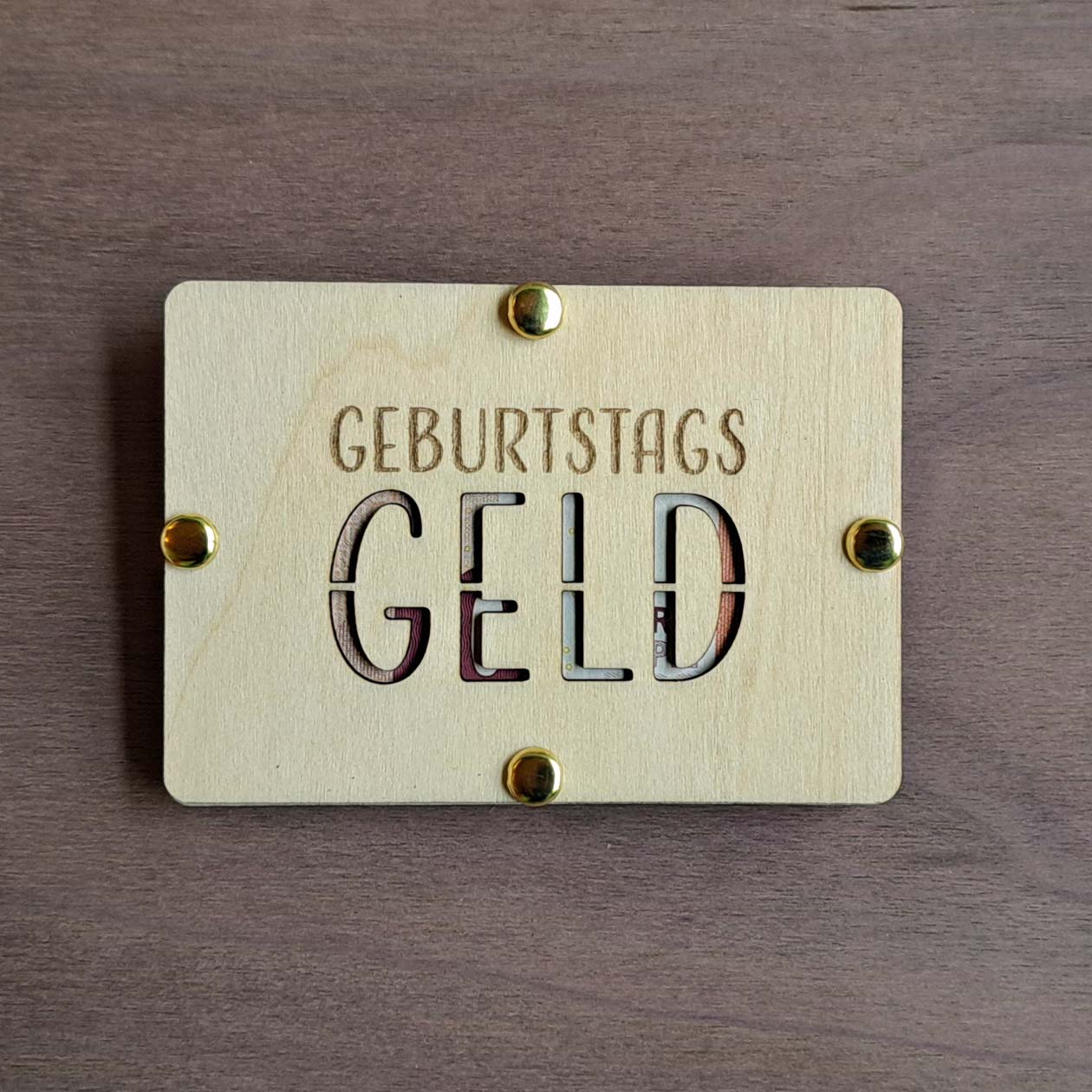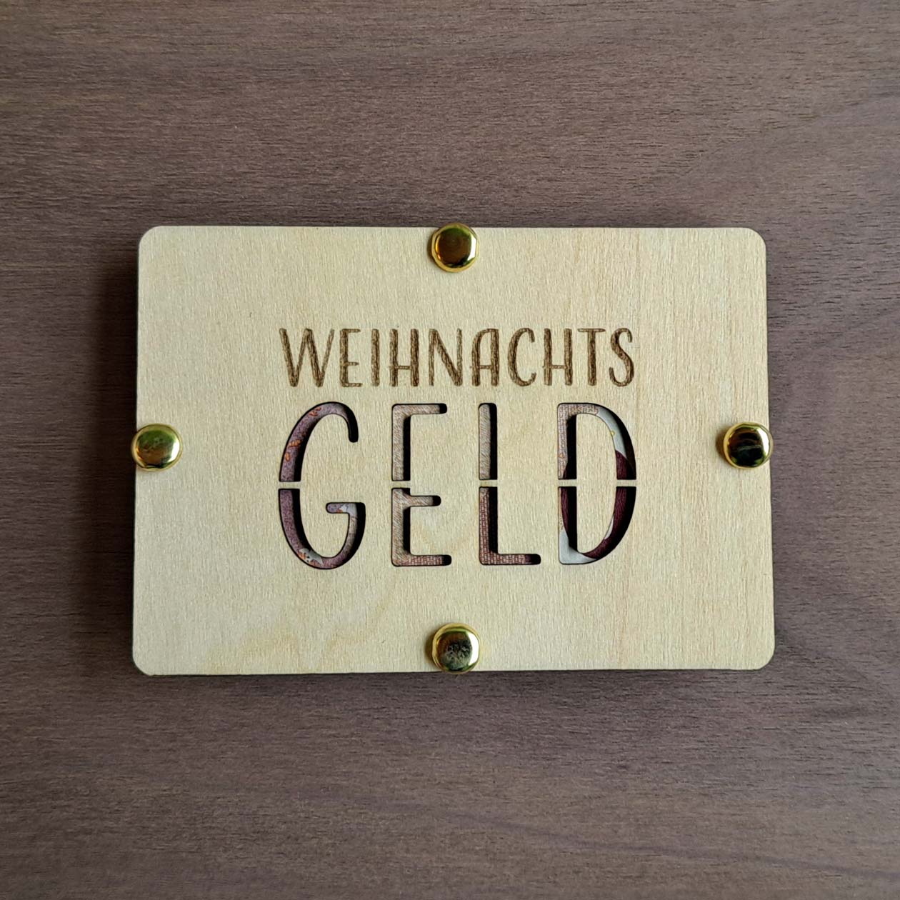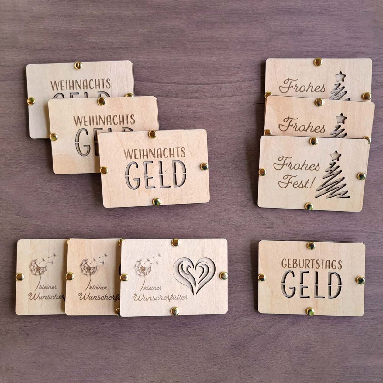 Lasergeschnittener Geldgeschenkhalter bzw. Geldgeschenkkarte aus Holz mit 4 Stück Musterbeutelklammern aus Metall. Auch für Gutscheine oder Gutscheinkarten geeignet.