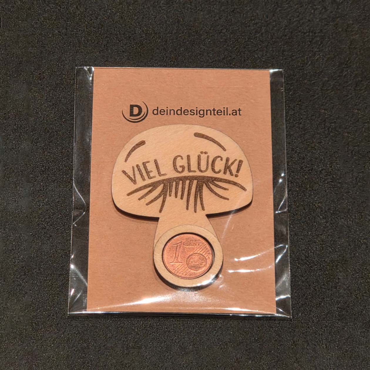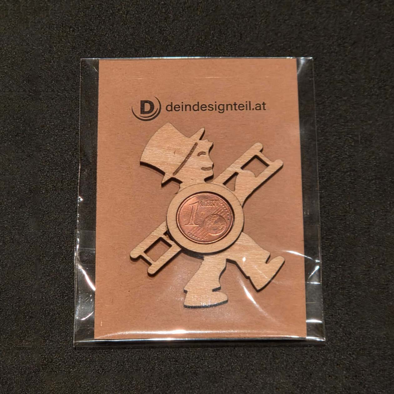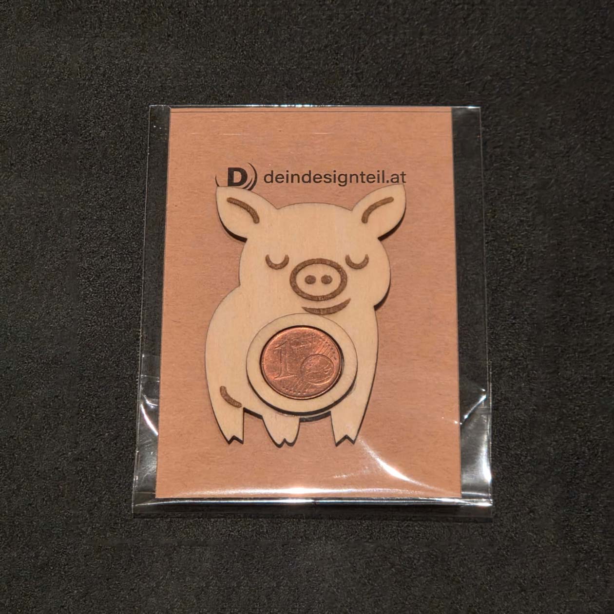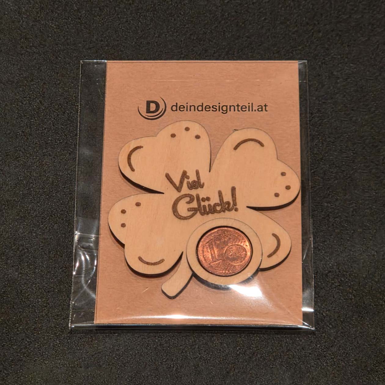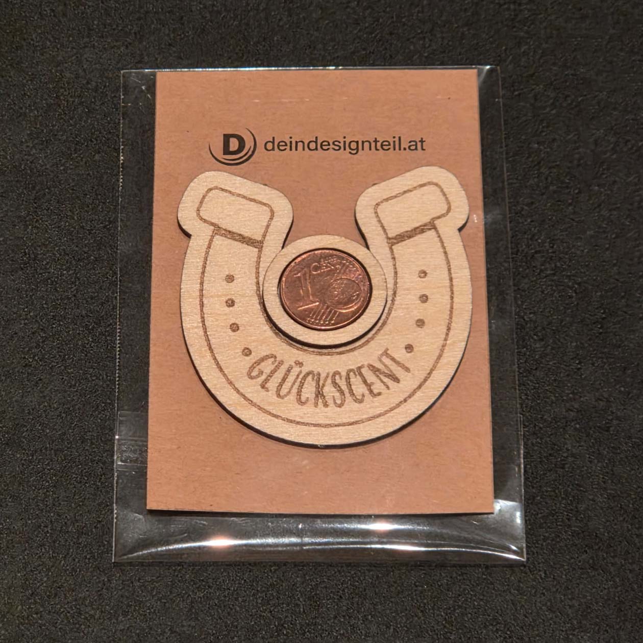 Lasergeschnittener Glücksbringer / Dekoartikel mit aufgeklebter 1-Cent-Münze auf Echtholz-Furnier Mehrschichtholz.